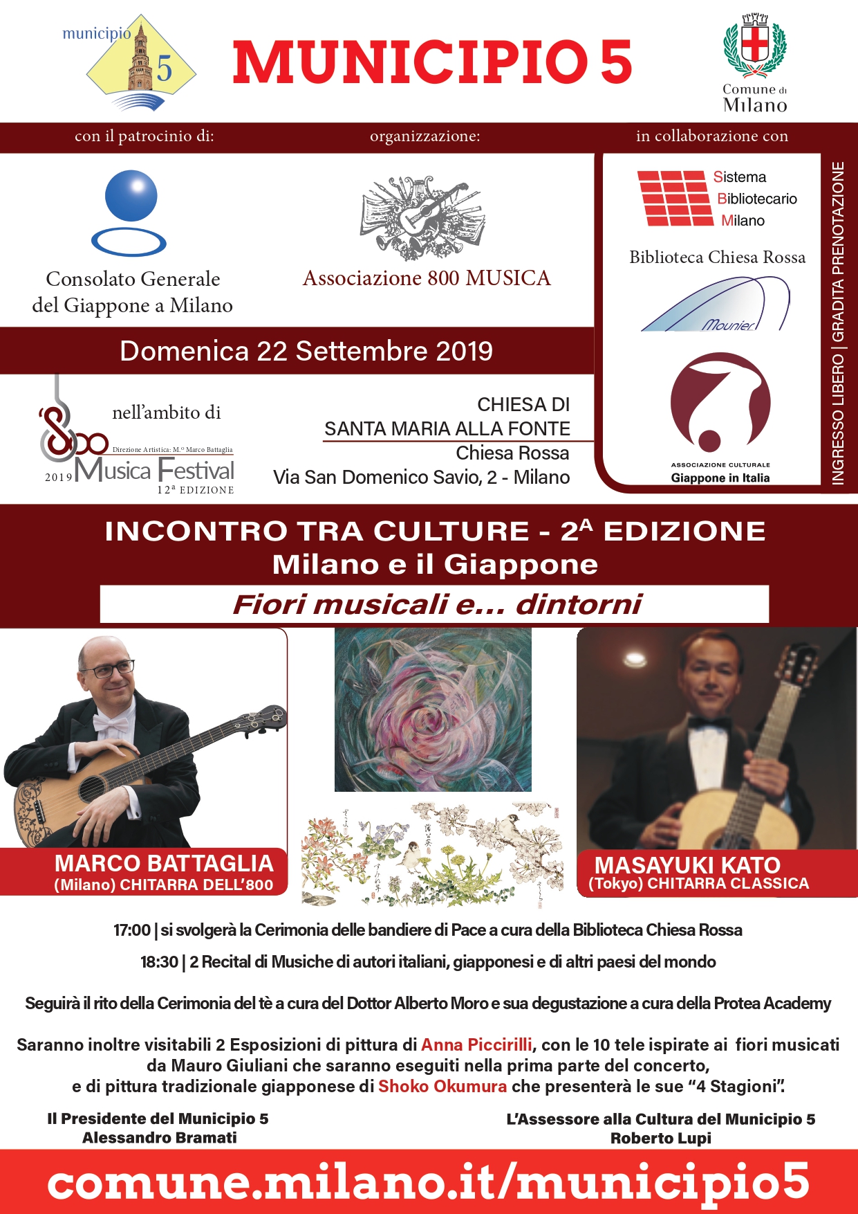 L’incontro tra culture, Milano e il Giappone, si terrà domenica 22 Settembre 2019 a partire dalle 17:00, alla Chiesa di Santa Maria alla Fonte, detta Chiesa Rossa, nell’ambito della 12a edizione dell’800MusicaFestival.